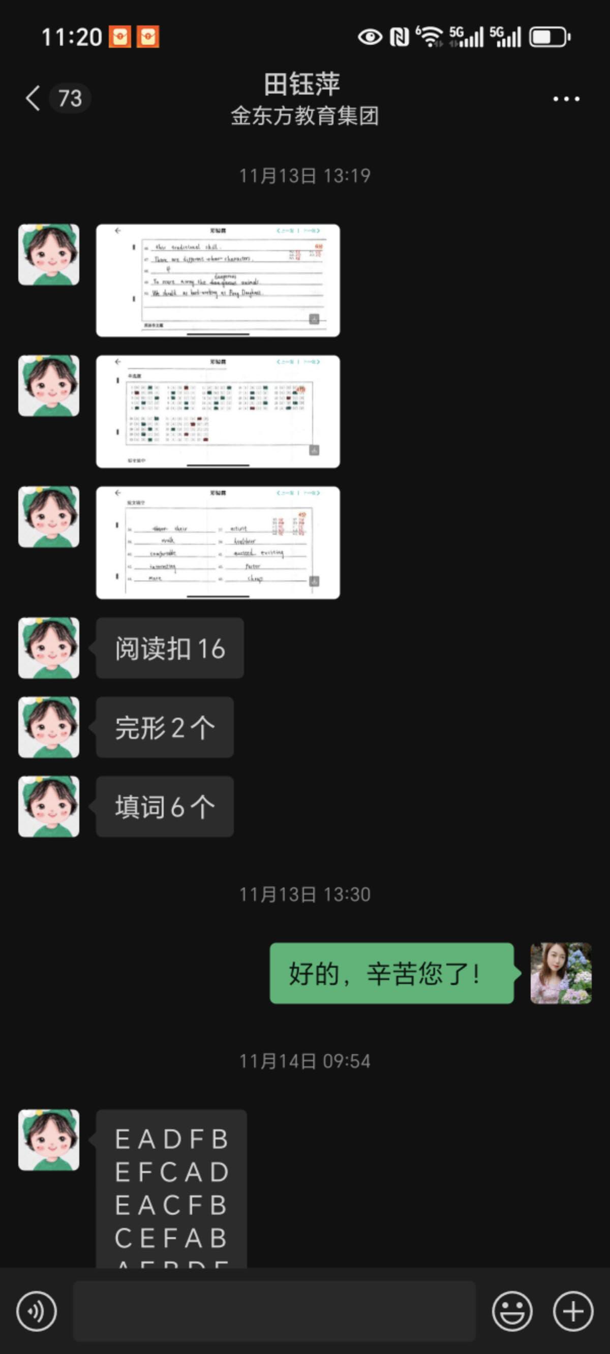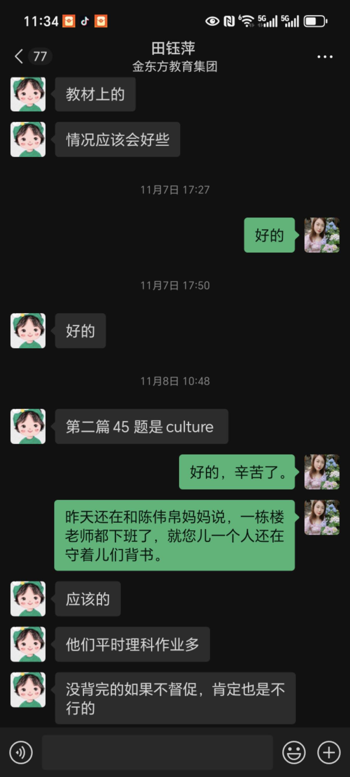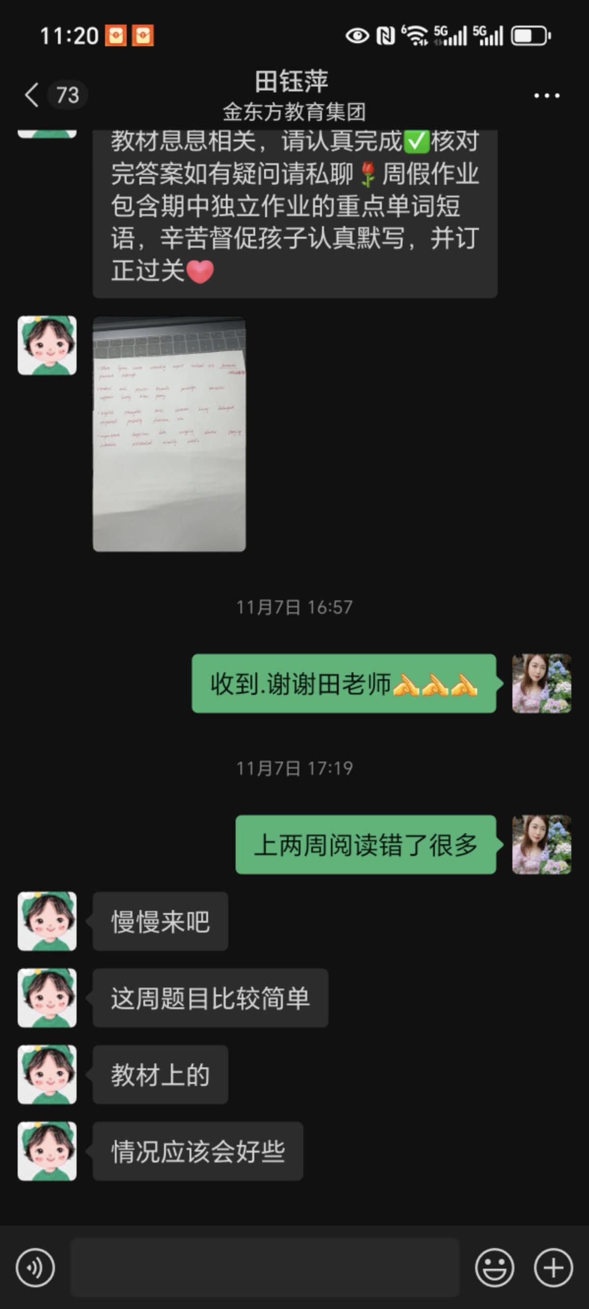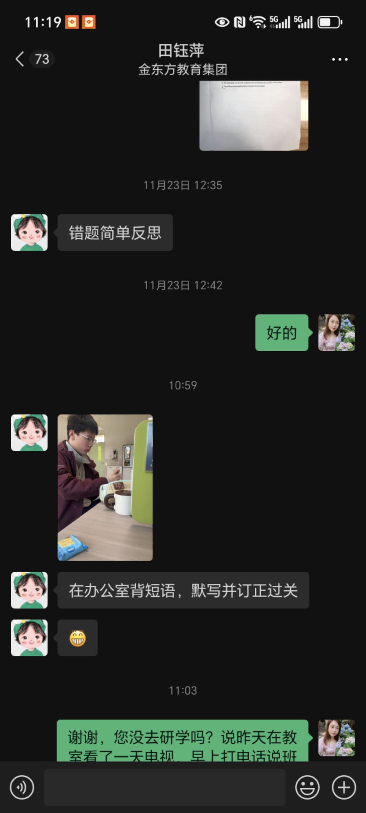 此次研学活动,孩子因特殊情况未能参与,本以为会错过一段宝贵的集体时光,没想到2406班田钰萍老师却把孩子带到办公室,利用这段时间耐心地陪伴他读、背、默,针对性地复习英语。这份对每个孩子都不放弃、不忽视的用心,让我们家长既感动又安心。更让我动容的是,田钰萍老师对孩子的关注从未局限于课堂之内。深知我家孩子阅读基础薄弱,每个周末都会特意为他准备阅读作业,收到我反馈的照片后,又会细致地为孩子进行辅导。不仅如此,每周五她都是在办公室守着孩子们英语背诵过关,周五常常到八九点才下班 。她还坚持挨个联系班里每一位英语薄弱的孩子,逐一落实周末学习情况。这份日复一日的坚守与负责,难能可贵。
