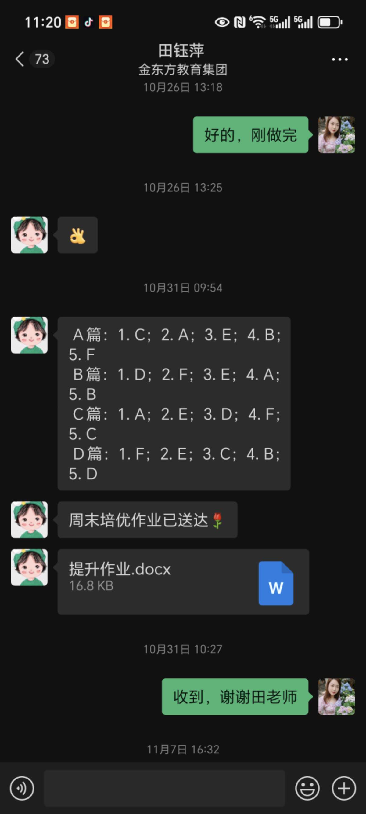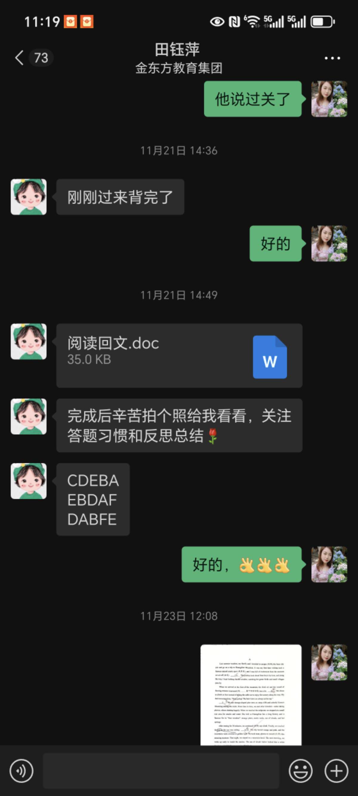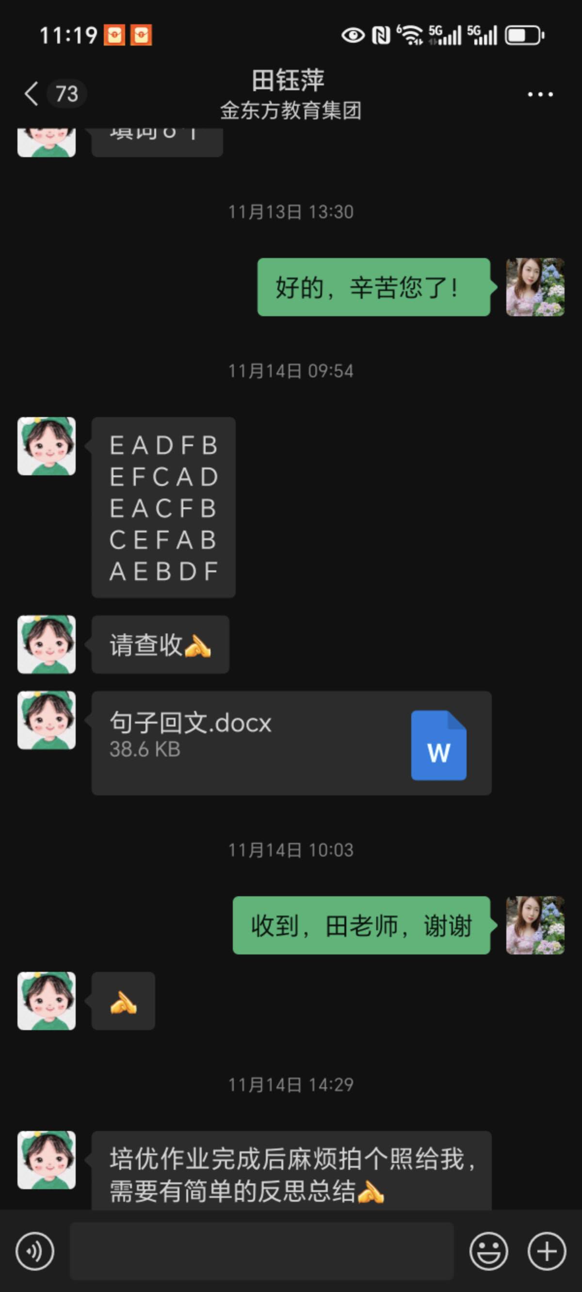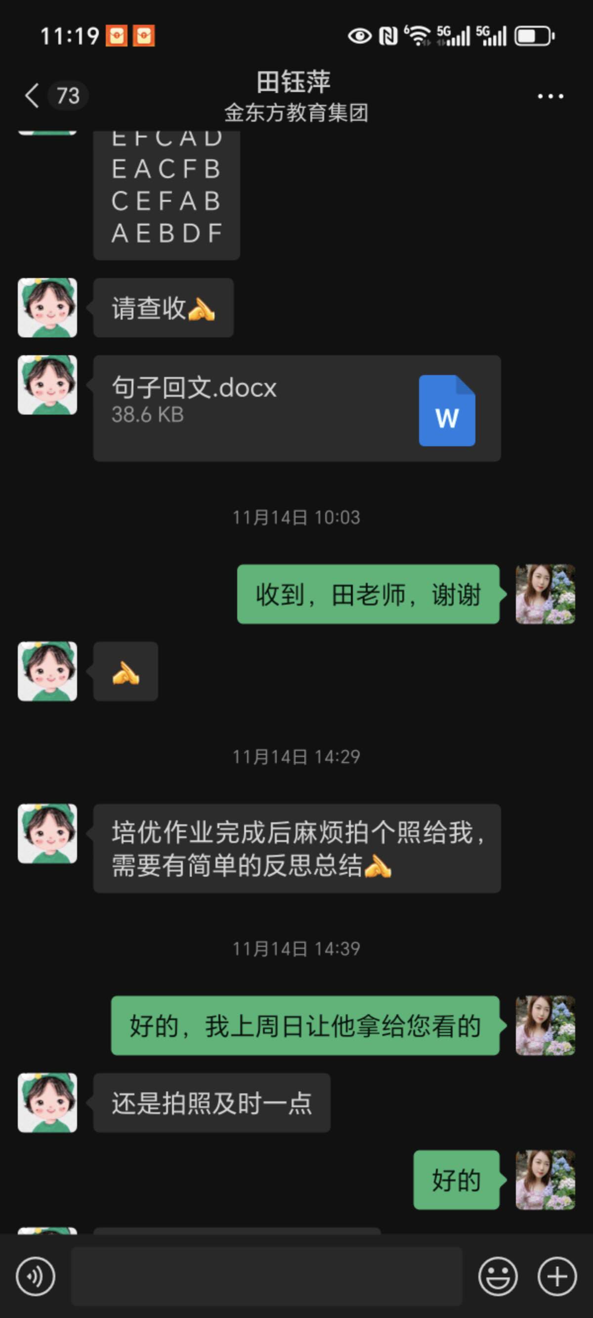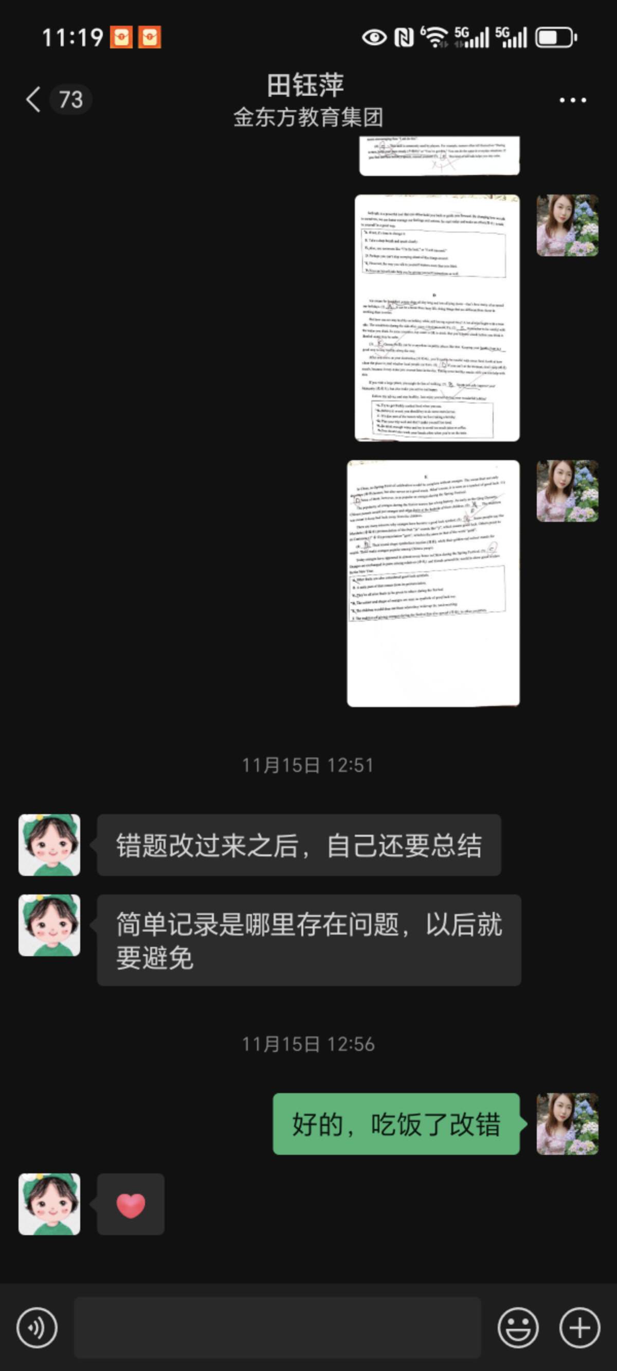 此次研学活动,孩子因特殊情况未能参与,本以为会错过一段宝贵的集体时光,没想到2406班田钰萍老师却把孩子带到办公室,利用这段时间耐心地陪伴他读、背、默,针对性地复习英语。这份对每个孩子都不放弃、不忽视的用心,让我们家长既感动又安心。更让我动容的是,田钰萍老师对孩子的关注从未局限于课堂之内。深知我家孩子阅读基础薄弱,每个周末都会特意为他准备阅读作业,收到我反馈的照片后,又会细致地为孩子进行辅导。不仅如此,每周五她都是在办公室守着孩子们英语背诵过关,周五常常到八九点才下班 。她还坚持挨个联系班里每一位英语薄弱的孩子,逐一落实周末学习情况。这份日复一日的坚守与负责,难能可贵。